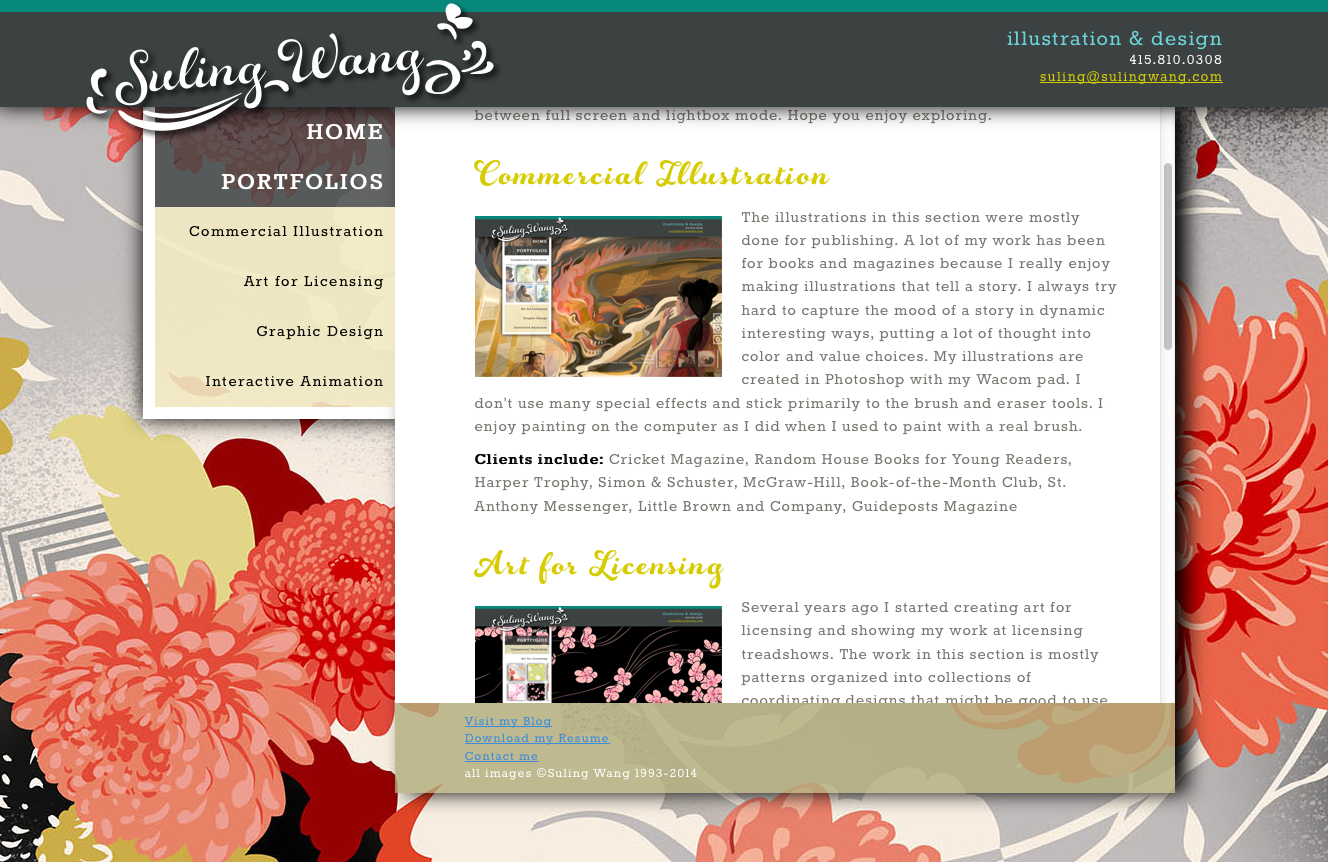 I’m an illustrator and designer with experience in a variety of commercial art fields. My illustrations have appeared in magazines and books. I’ve worked with software and web developers as graphic designer, production artist, web designer, Flash animator, and Actionscript programmer. My surface design work has been shown at national tradeshows and licensed by manufacturers for use on fabric, stationery, invitations, scrapbooking and home décor products. I enjoy the variety and the challenge of trying new things. A common theme in my work is that I love playing with color, telling stories and creating a mood in my art.